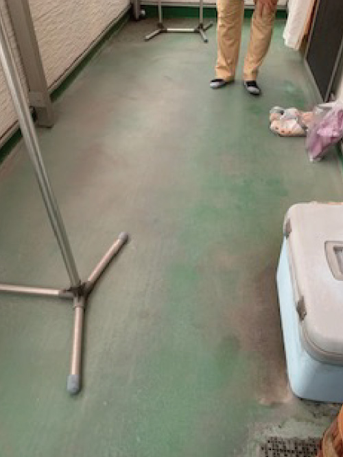 ↓元々のベランダはこんな感じの色合い。床部分のウッドデッキパネルを一旦外させていただき、